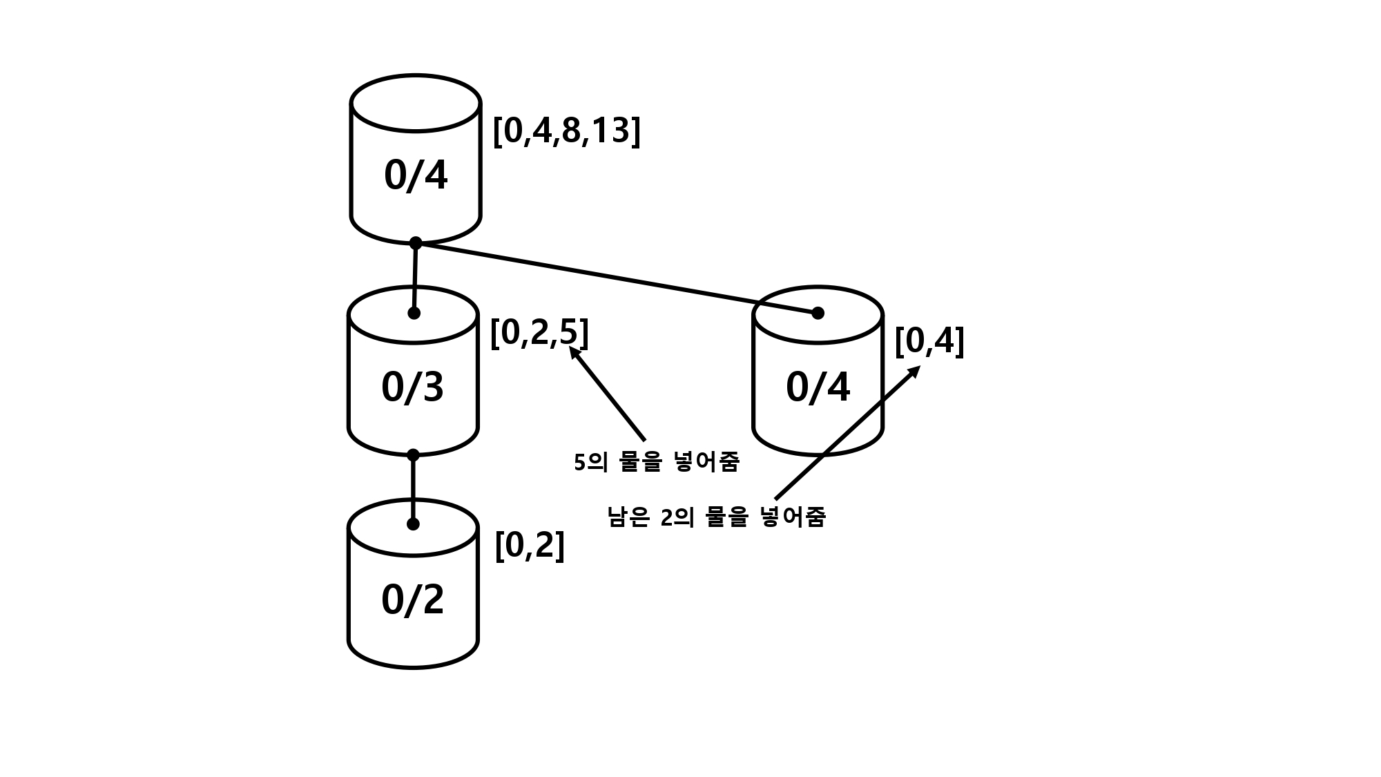 마지막으로 자식이 두 개인 물탱크이다(이진 트리이므로 최대가 2개). 이 경우는 채우는 과정을 생각하며 상황을 나눠줘야 한다.
